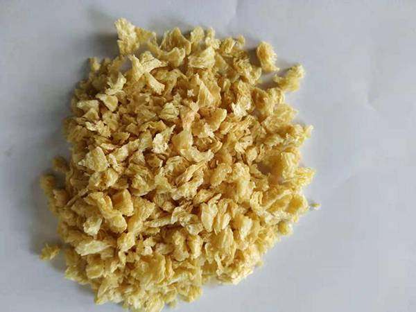 組織蛋白有粒狀、塊狀、片狀、絲狀等不同形態(tài),呈不同深淺的黃褐色,其網(wǎng)狀結(jié)構(gòu)成定向排列,形成具彈性、韌性的纖維束或積層,使在食用時(shí)有類似肉食肌肉組織的咬勁。典型的組織蛋白含蛋白質(zhì)60%左右??捎米鞣氯庵破返募±w維材料。